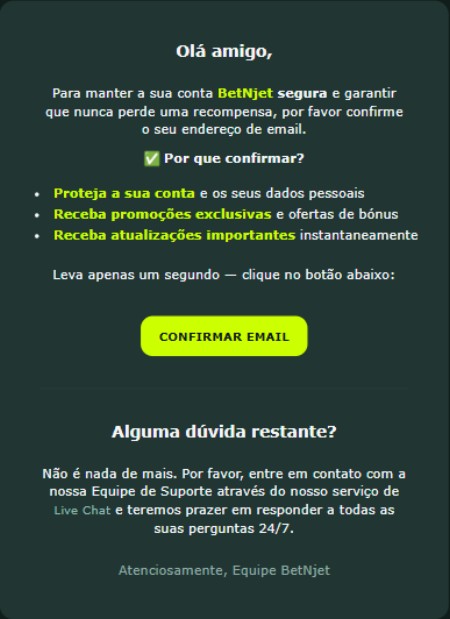 Receberá uma mensagem da BetNjet no seu endereço de e-mail. Abra-a e clique no link para validar a sua conta e confirmar que o email é seu.