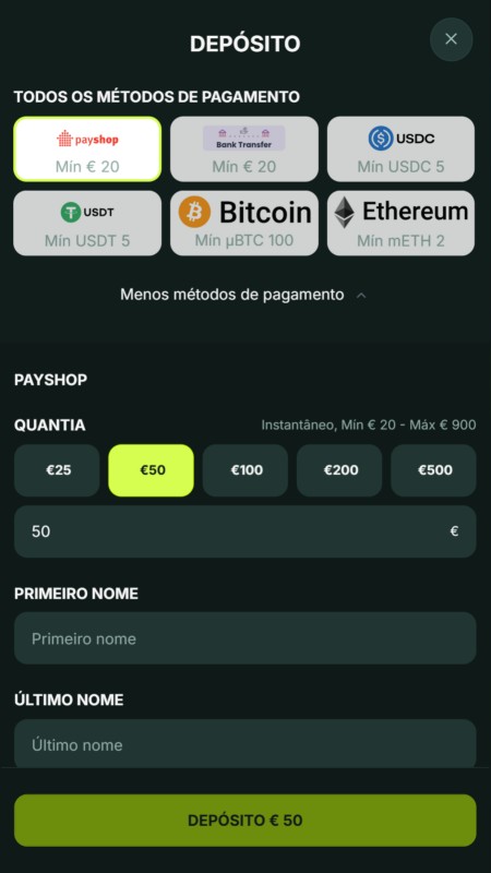 Escolha um método de pagamento e transfira pelo menos 20 € para a sua conta. Depois, pode reivindicar o bónus de boas-vindas e começar a apostar nos seus desportos e jogos favoritos.