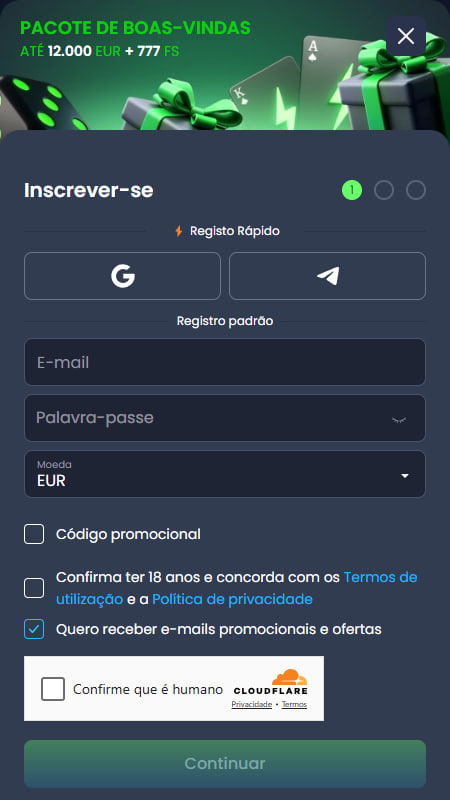 | 💸 Pacote de bónus de boas-vindas de casino | 500% bónus até 12.000 € + 777 RG divididos por seis depósitos |