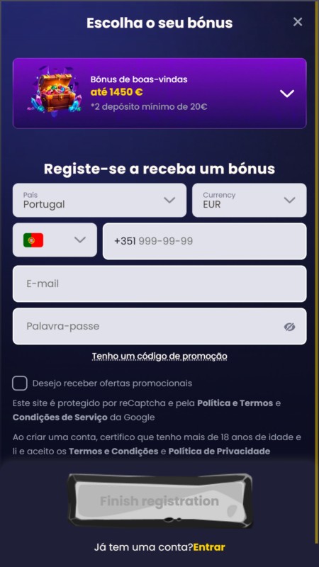 | 🎁 Bónus de Boas-Vindas | 260% até 1450 € + 225 RG |