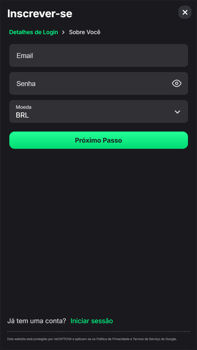 Preencha suas informações pessoais como email e senha, escolha a moeda desejada e clique em “Próximo Passo”;